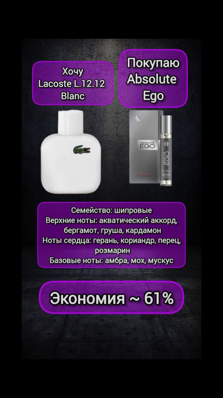 Absolute Ego, парфюмерная вода для мужчин, 20 мл - Коллекция ароматов Ciel / Lacoste L.12.12. Blanc | Siberian Wellness | 🗑 |